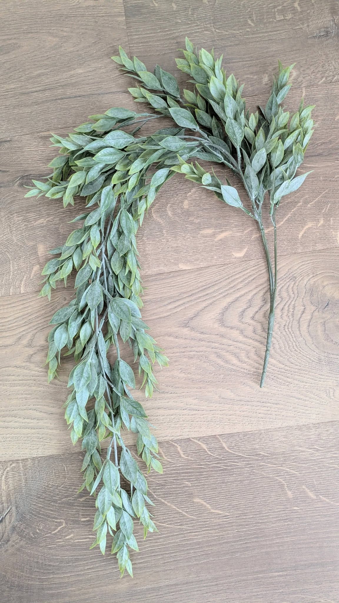 A lovely accent to create a graceful cascading in hanging baskets or a mantel for a touch of effortless beauty. Features a multitude of spear shaped leaves with a powdered finish that creates a lush bed of greenery. 33" long
