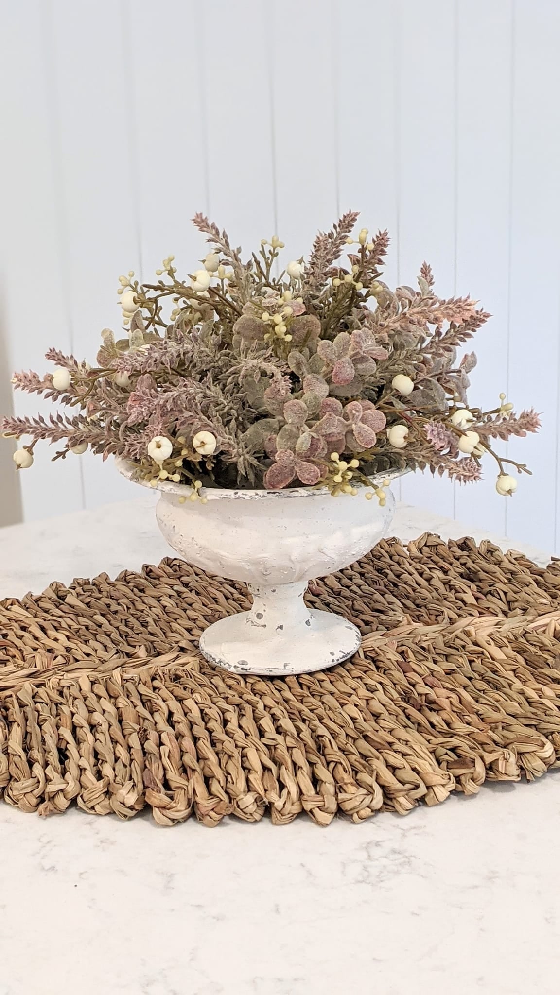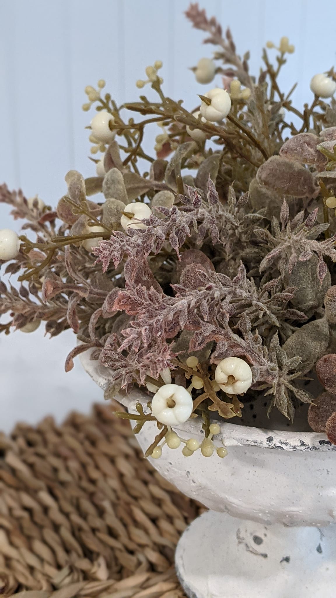 A charming mixture of sage green foliage and lavender-like spires with small, white pumpkin-like berries and berry-like orbs. Place in a basket or bowl for instant floral decorating.